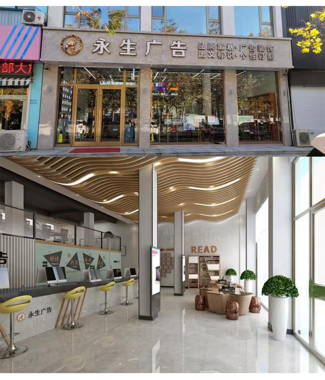 公司自有數碼沖床設備、500W光纖機、高精度大幅面噴繪機、寫真機、UV機、多種大小型雕刻機、吸塑機、全自動圍字機、自動開槽機、激光焊接機、拋光機等生產加工設備,擁有完善的設計團隊、技術團隊、施工團隊、售后團隊,可為廣大客戶提供室內裝修、店招門頭、精神堡壘、黨建標識、標識標牌、宣傳欄、LED顯示屏、警示標識、精品字、證卡胸牌、證書獎杯、燈箱、桌牌、定制禮品、展具、噴印等多種專業(yè)廣告服務...